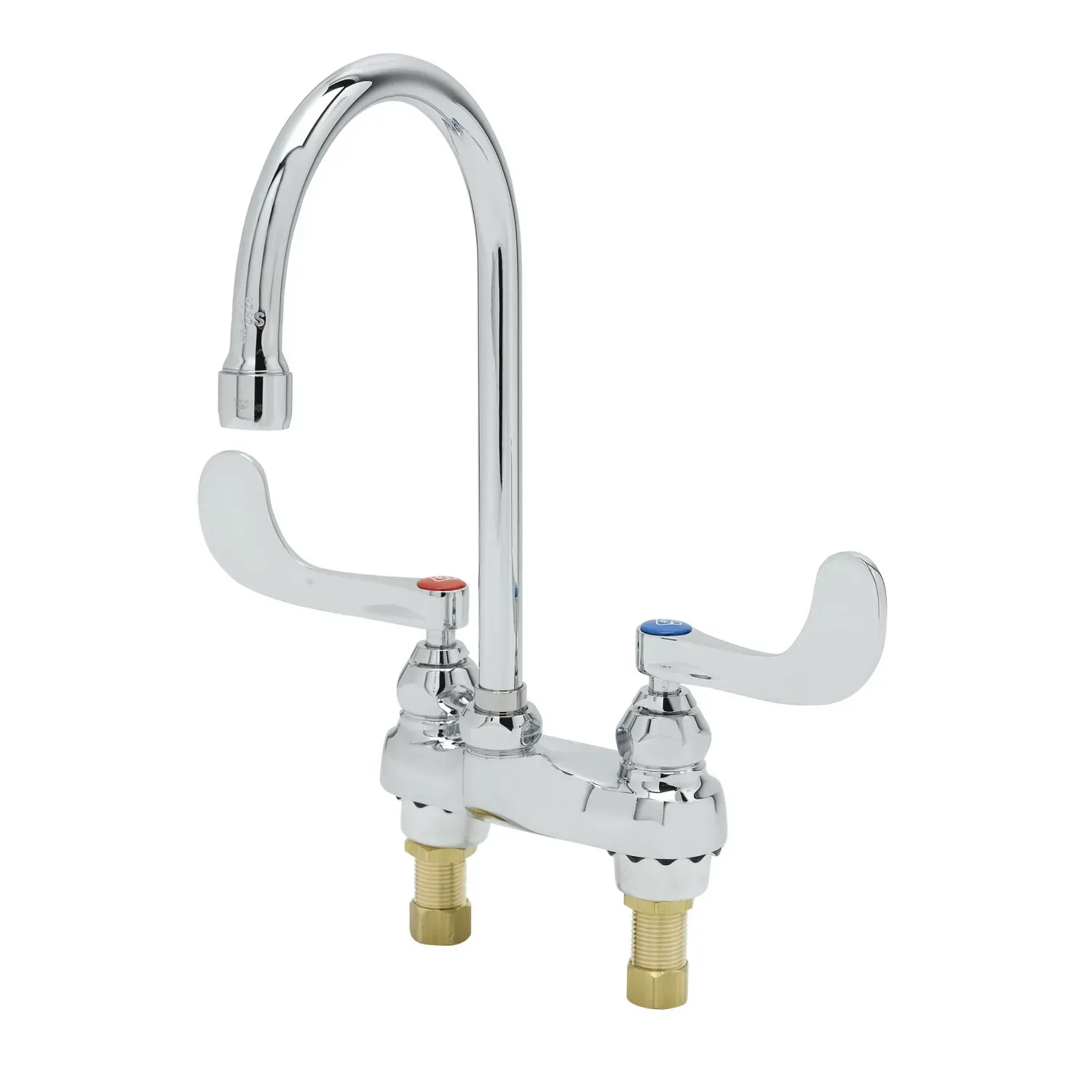 Facilitate Equipment Reliability with the T&S Brass B-0892-122X-LAM Manual Faucet. Designed specifically for commercial restaurant use, this medical faucet ensures durability and functionality in high-demand environments. The 4" centerset deck mount mixing faucet features a polished chrome plated brass body, guaranteeing long-lasting performance. The 5 3/4" swivel/rigid gooseneck allows for easy maneuverability, while the 2.2 GPM laminar flow device ensures a steady and consistent water stream. With compression cartridges and spring checks, this faucet provides reliable water control and prevents leaks. The 4" wrist action handles offer effortless operation, perfect for busy kitchen staff. Certified to ASME A112.18.1/CSA B125.1, NSF 61-Section 9, and NSF 372, this faucet meets industry standards for safety and quality. Additionally, it complies with ADA ANSI/ICC A117.1 requirements, ensuring accessibility for all users. Enhance your restaurant's efficiency and reliability with the T&S Brass B-0892-122X-LAM Manual Faucet.