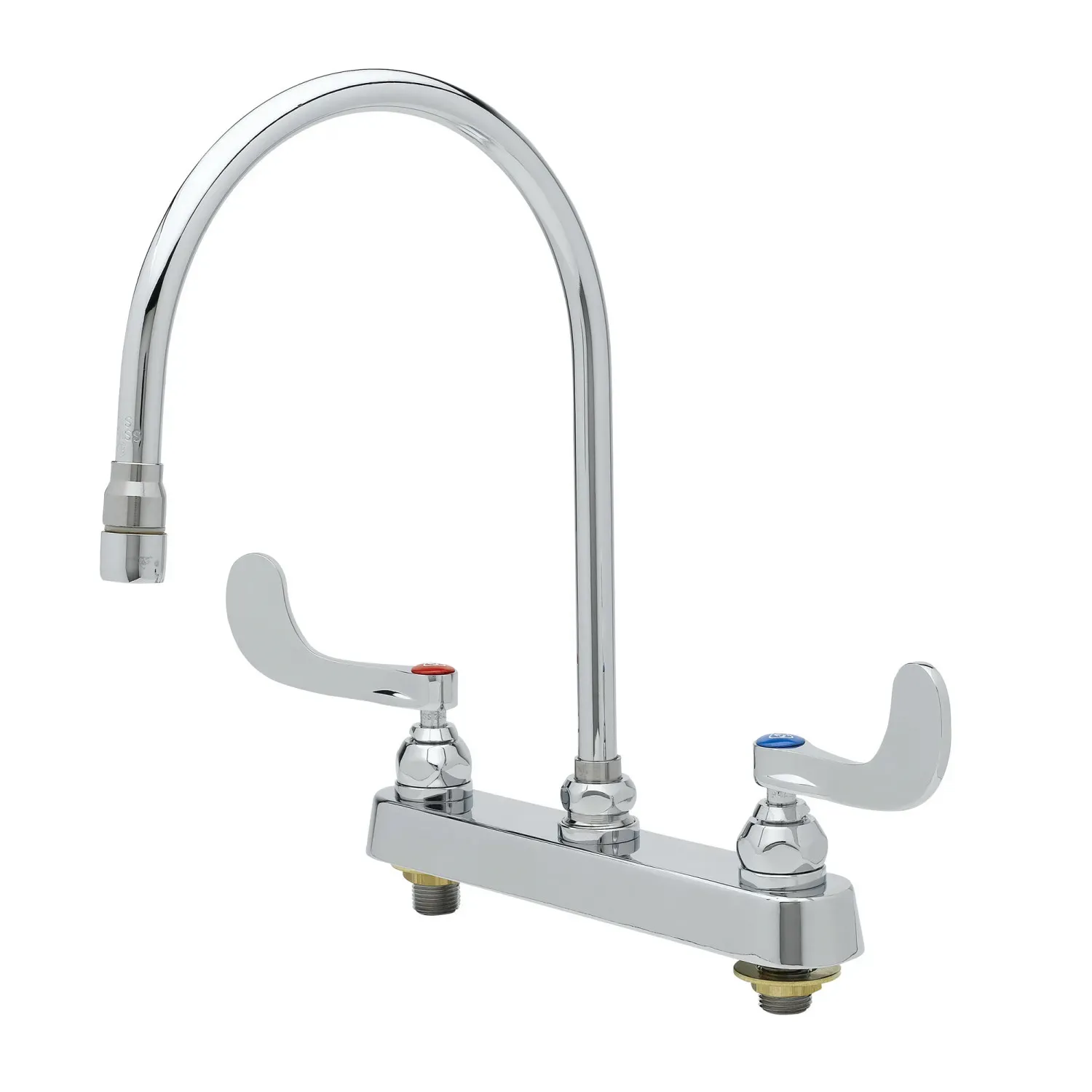 Improve Overall Functionality with T&S Brass, B-1120-135X-WH4, Manual Faucets. This 8" deck mount workboard mixing faucet is designed to enhance the efficiency of your commercial restaurant. With its chrome plated brass body, it offers durability and longevity, ensuring it can withstand the demands of a busy kitchen. The 8 13/16" swivel/rigid gooseneck with a 2.2 GPM aerator provides flexibility and convenience, allowing you to easily fill and rinse large pots and pans. The compression cartridges with spring checks ensure smooth operation and prevent leaks, saving you time and money on maintenance. The 4" wrist action handles offer ergonomic control, making it effortless to adjust water temperature and flow. Certified to ASME A112.18.1/CSA B125.1, NSF 61-Section 9, and NSF 372, this faucet meets industry standards for safety and quality. Upgrade your restaurant's functionality with T&S Brass, B-1120-135X-WH4, Manual Faucets.