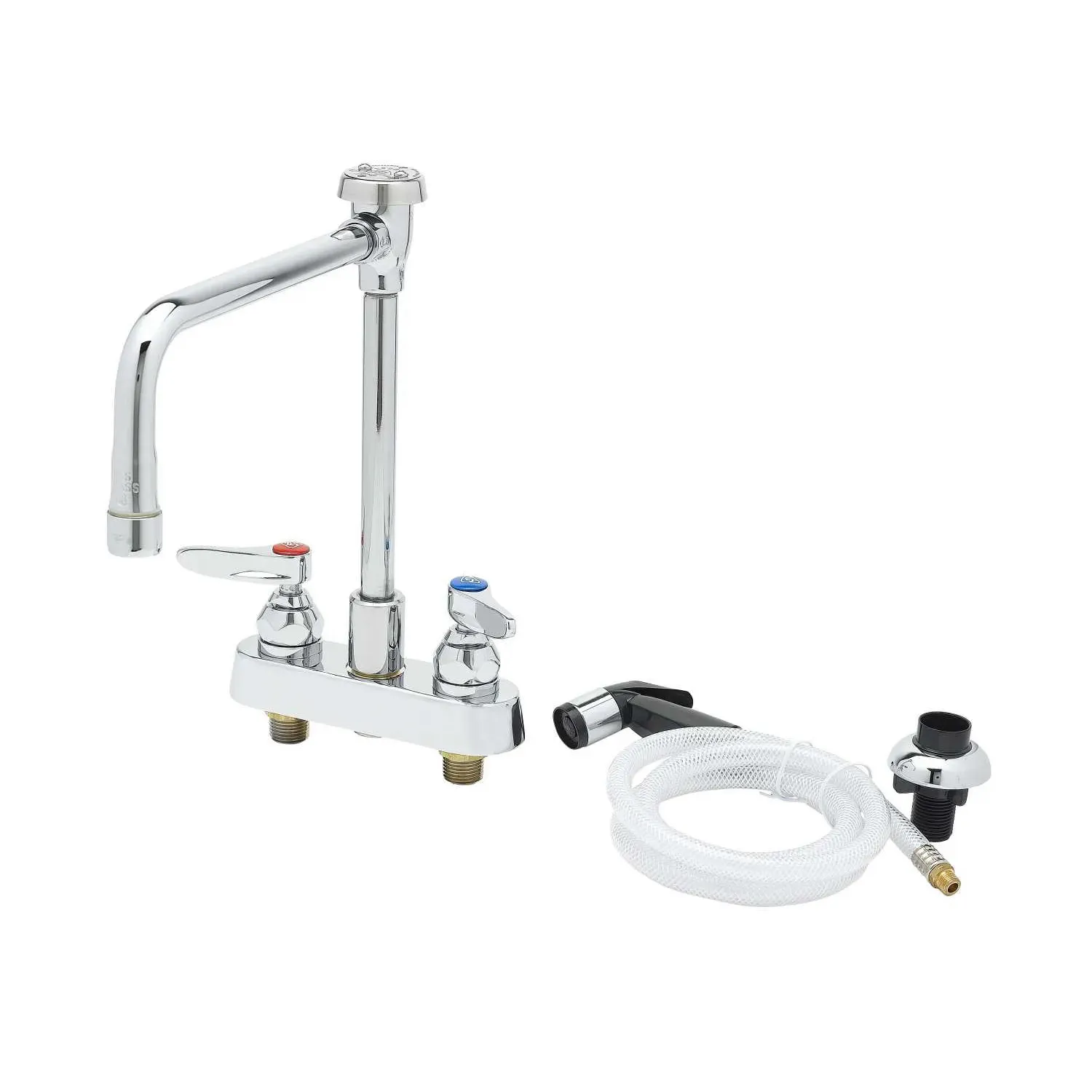 Ensure Efficient Functionality with T&S Brass, B-1177, Manual Faucets. This workboard faucet is designed for commercial restaurant use, offering reliable performance and convenience. The deck mount design with 4" centers allows for easy installation and a secure fit. The chrome plated brass body ensures durability and a sleek appearance that complements any kitchen decor. With a rigid spout and vacuum breaker nozzle, this faucet provides a steady flow of water while preventing backflow contamination. The 2.2 GPM aerator ensures efficient water usage without compromising on performance. The lever handles offer easy control and the swivel to rigid adapter with diverter allows for seamless switching between the faucet and side spray. Certified to meet various industry standards, including ASME, CSA, NSF, and ADA, this T&S Brass faucet is a reliable choice for any commercial restaurant.