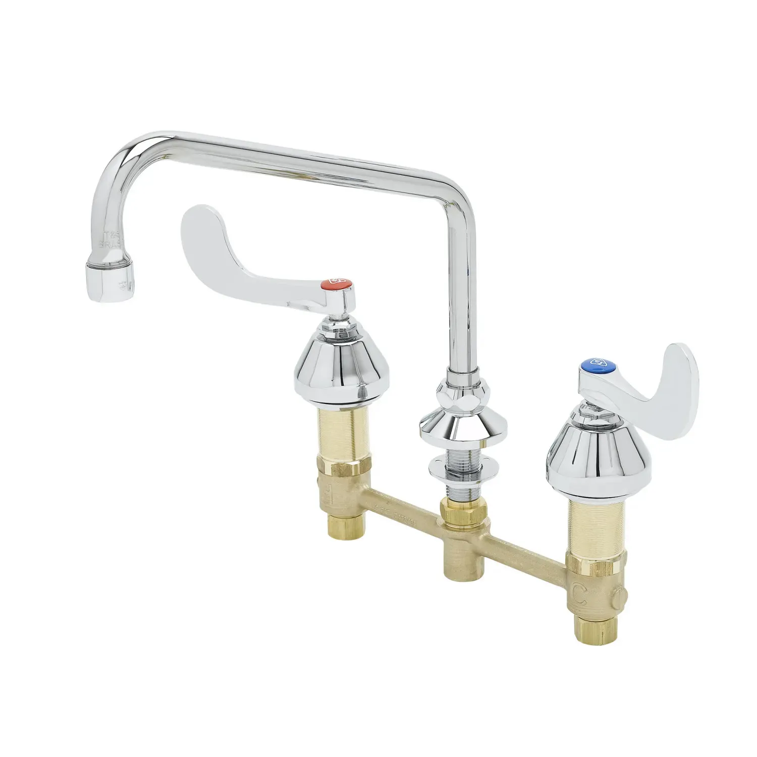 Improve System Efficiency with the T&S Brass B-2347-09-WH4 Manual Faucet. This 8" concealed widespread faucet is designed to enhance the functionality of your commercial restaurant. With a 9-1/2" swing nozzle and a 2.2 gpm aerator, this faucet ensures a steady flow of water for all your kitchen needs. The 4" wrist handles provide easy control and maneuverability, allowing your staff to efficiently handle tasks. The chrome plated escutcheons and 1/2" NPT male inlets with coupling nuts ensure durability and longevity, even in a high-demand environment. Certified to ASME A112.18.1/CSA B125.1, NSF 61-Section 9, and NSF 372, this faucet meets the highest industry standards for safety and quality. Additionally, it complies with ADA ANSI/ICC A117.1 requirements, making it accessible for all users. Upgrade your restaurant's efficiency with the T&S Brass B-2347-09-WH4 Manual Faucet.