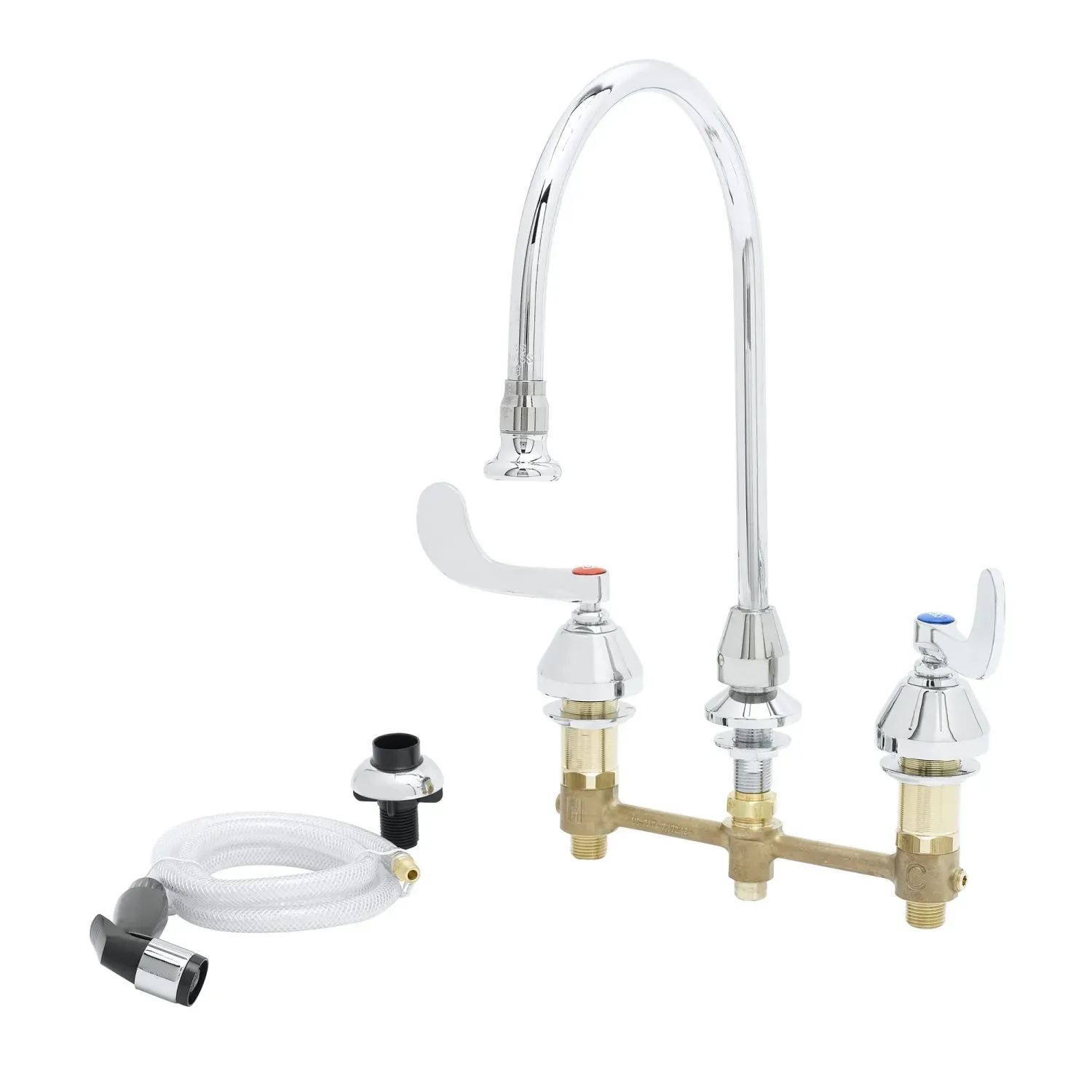 Maintain Equipment Integrity with T&S Brass, B-2347, Manual Faucets. This medical faucet is designed for commercial restaurant use, ensuring the highest standards of hygiene and durability. With its 8" concealed deck mount mixing faucet and 8 13/16" swivel gooseneck, this faucet provides easy access to water for various tasks in the kitchen. The 2.2 GPM rosespray outlet delivers a powerful stream of water, perfect for rinsing dishes and cleaning surfaces. The compression cartridges with spring checks ensure smooth operation and prevent leaks, while the 4" wrist action handles offer easy control and accessibility. The chrome plated escutcheons add a sleek and professional touch to any restaurant setting. Certified to ASME A112.18.1/CSA B125.1, NSF/ANSI 61-Section 9, and NSF/ANSI 372, this faucet meets the highest industry standards for safety and quality. Upgrade your restaurant's equipment with the T&S Brass, B-2347, Manual Faucets and experience reliable performance and long-lasting durability.