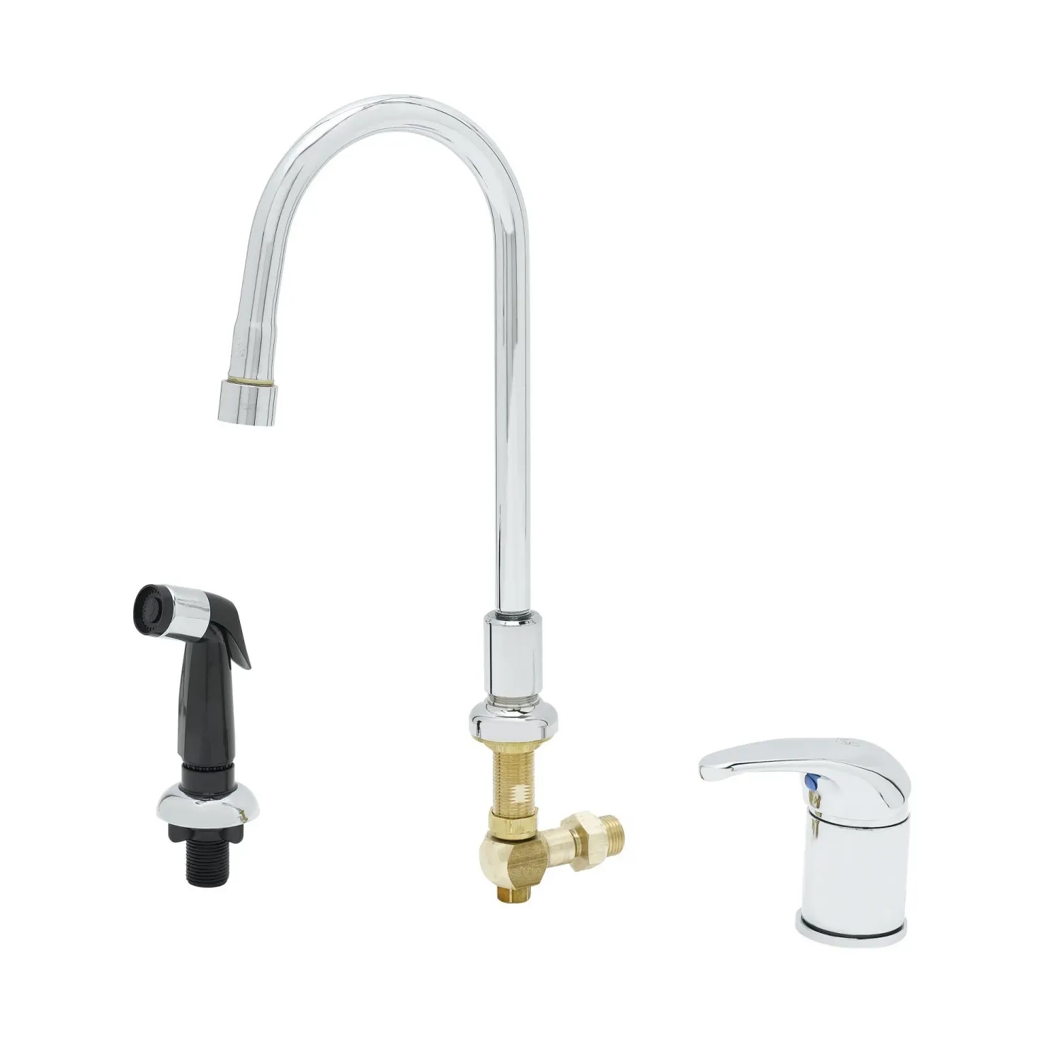 Upgrade Equipment Efficiency with the T&S Brass B-2744 Manual Faucet. Designed for commercial restaurant use, this deck-mounted single lever faucet offers convenient control with its remote on/off control base. The polished chrome plated brass body and rigid gooseneck provide durability and a sleek appearance. The 2.2 GPM vandal-resistant aerator ensures a steady flow of water while conserving resources. With a ceramic cartridge and adjustable temperature limit stop, you can easily set the desired water temperature. The single lever handle allows for effortless operation, and the 16" flexible stainless steel supply hoses with 3/8" compression connections ensure easy installation. The included 4' sidespray with hose guide adds versatility to your kitchen tasks. Certified to meet ASME A112.18.1/CSA B125.1, NSF 61-Section 9, and NSF 372 standards, this faucet is also ADA compliant, making it a reliable and accessible choice for any commercial restaurant. Upgrade your kitchen's efficiency with the T&S Brass B-2744 Manual Faucet.