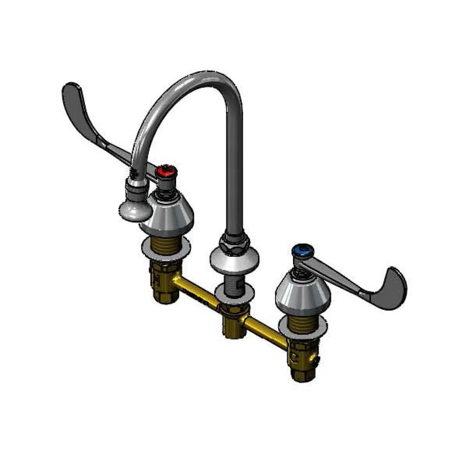 Optimize Equipment Function with T&S Brass, B-2866, Manual Faucets. This medical faucet is designed for commercial restaurant use, offering exceptional functionality and durability. With an 8" concealed deck mount mixing faucet and a forged brass body, this faucet ensures reliable performance in high-volume settings. The 5 13/16" rigid/swivel gooseneck with a 2.2 GPM rosespray outlet provides versatility for various tasks, while the compression cartridges with spring checks guarantee smooth operation. The 6" wrist action handles offer easy control and convenience, allowing staff to adjust water flow effortlessly. This faucet is certified to meet ASME A112.18.1/CSA B125.1, NSF 61-Section 9, and NSF 372 standards, ensuring compliance with health and safety regulations. Additionally, it meets ADA ANSI/ICC A117.1 requirements, making it accessible for all users. With chrome plated escutcheons and 1/2" NPT male inlets with coupling nuts, this T&S Brass faucet is a reliable choice for any commercial restaurant seeking a high-quality, long-lasting solution.