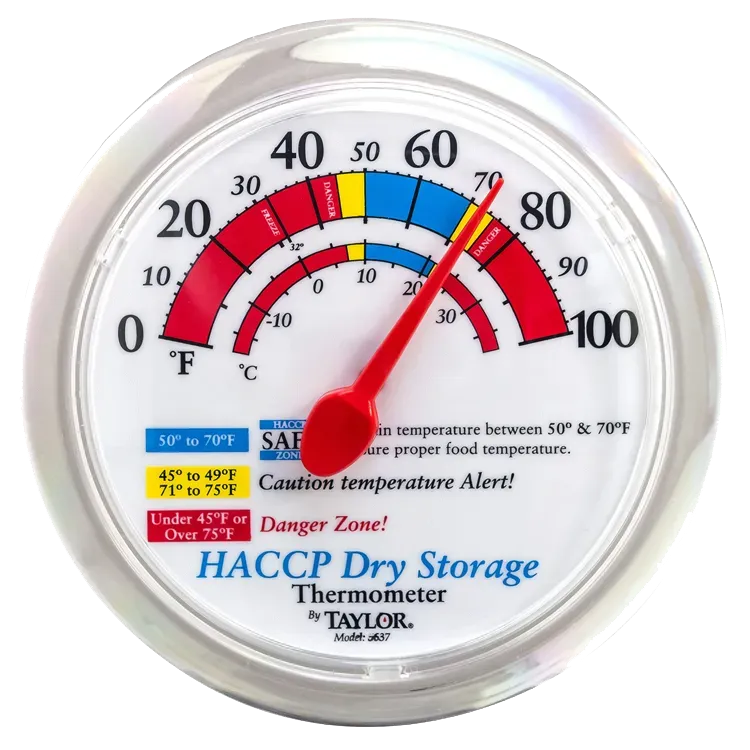 Elevate accuracy with the Taylor Precision, 5637, Thermometer, Time Temp HACCP. Designed specifically for commercial restaurant use, this 6" bi-metal thermometer is a must-have for ensuring food safety and quality. With a temperature range of 0 to 100°F (-17 to 37°C), this HACCP prep and dry storage thermometer provides accurate readings to help you maintain optimal storage conditions for perishable items. The easy-read numerals and clear bezel make it effortless to monitor temperatures at a glance, while the color-coded temperature zones allow for quick identification of safe temperature ranges. This thermometer comes with a convenient wall mount bracket, ensuring it is always within reach and easily visible. Trust Taylor Precision for reliable and precise temperature measurements in your commercial kitchen.