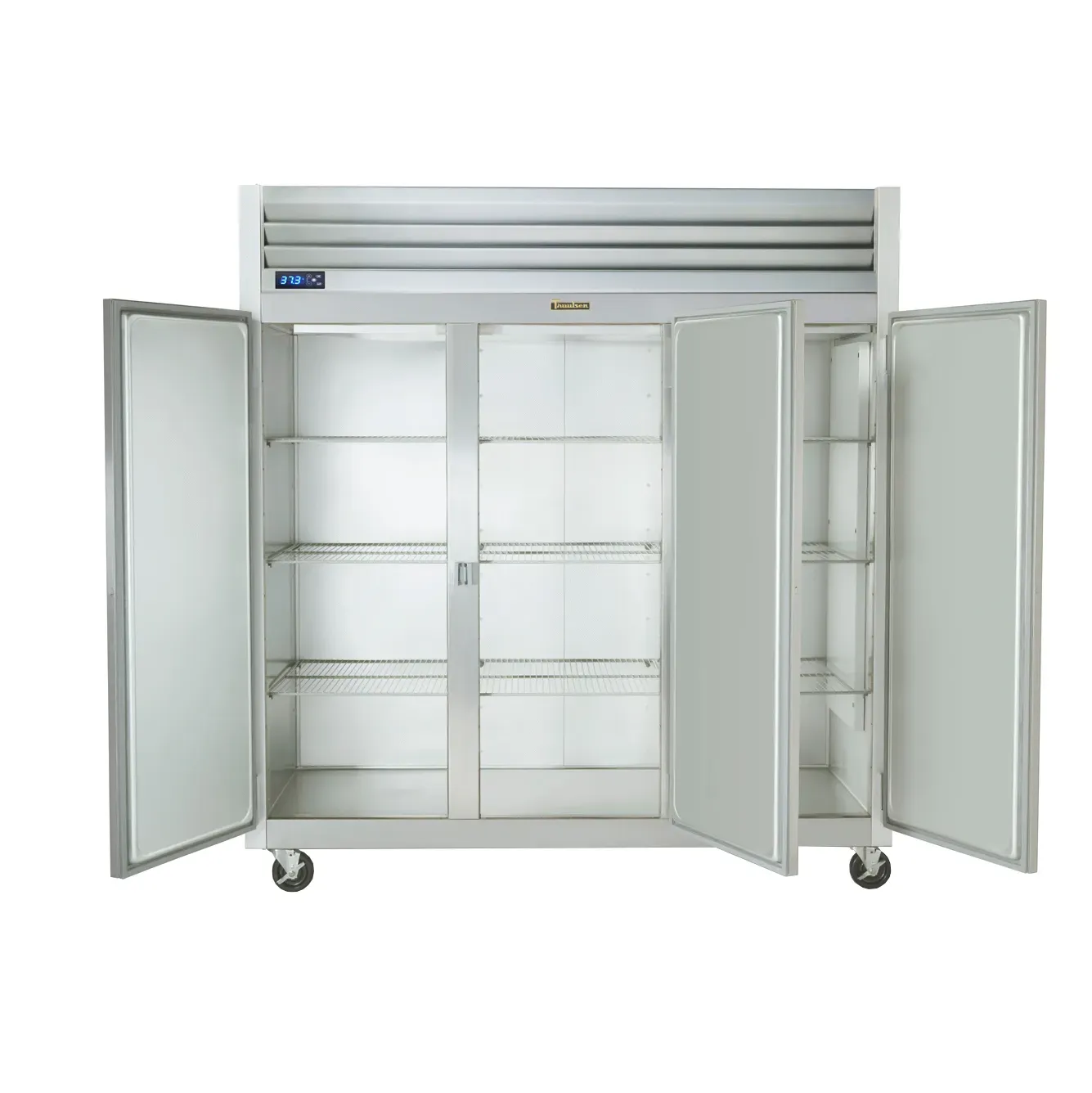The refrigerator features three full-height solid doors, all hinged on the left, ensuring easy access to your ingredients and supplies. The top-mounted, self-contained refrigeration system utilizes non-flammable R-450A refrigerant and a powerful 1/2 HP motor, providing reliable and efficient cooling performance.