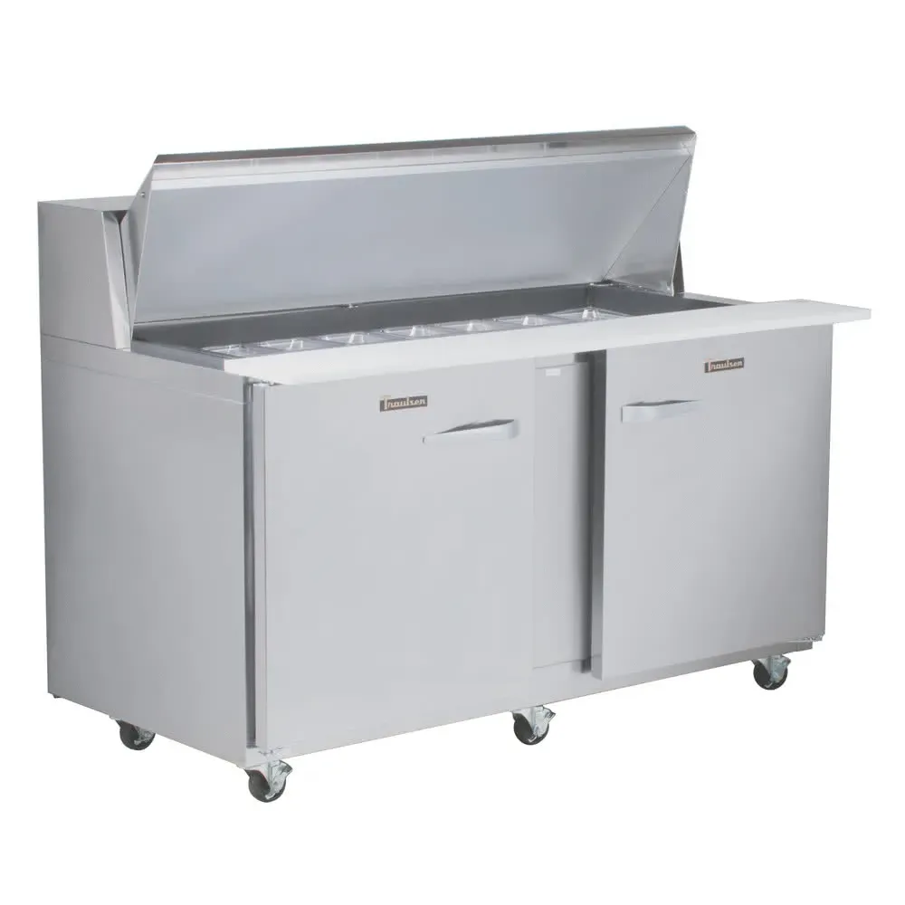 Maintain perfect temperatures with the Traulsen Dealers Choice Compact Prep Table Refrigerator, an essential addition to any restaurant kitchen. This versatile reach-in, two-section unit, measuring 60 inches wide, is designed to streamline your food preparation process while ensuring optimal freshness.