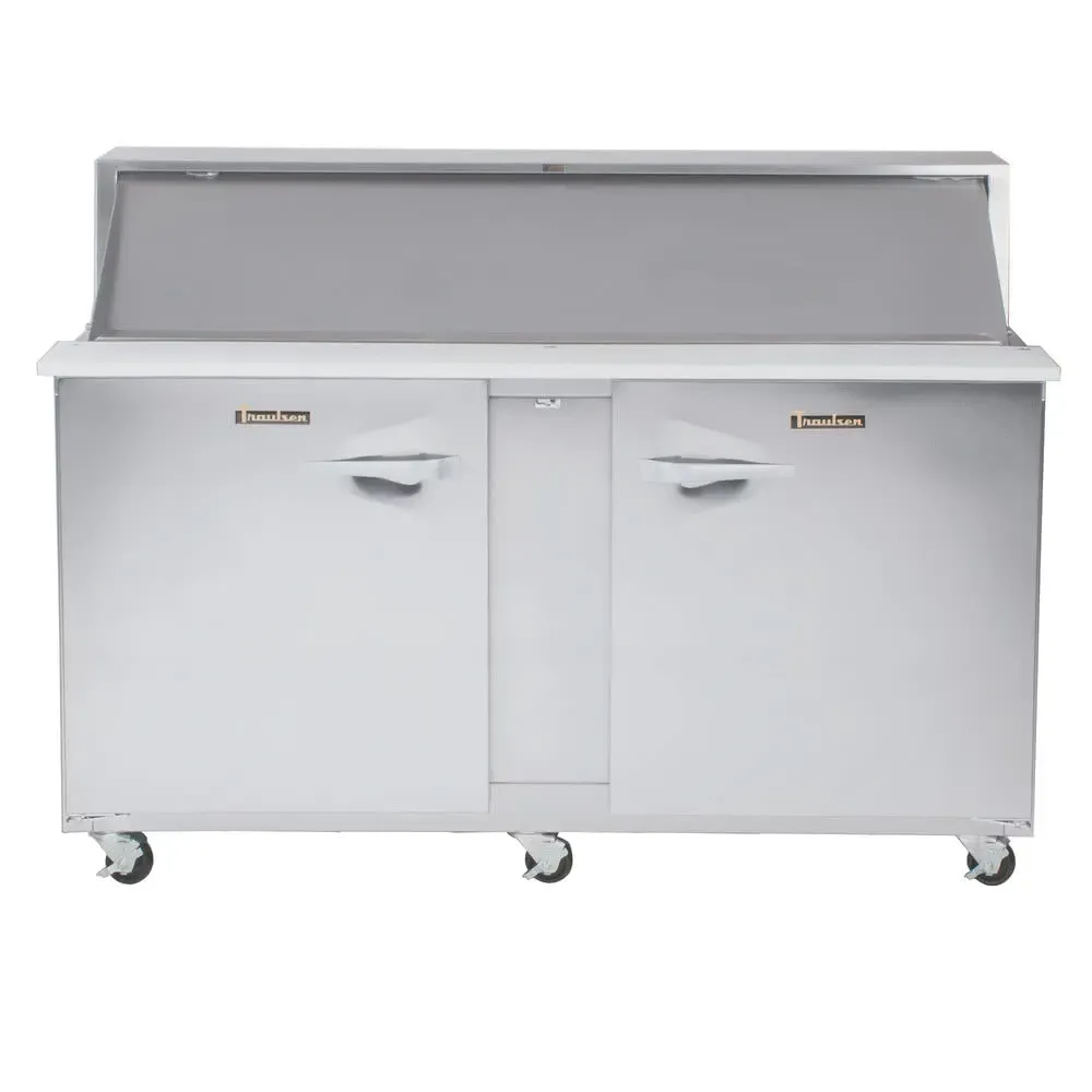 The Traulsen Dealers Choice Compact Prep Table Refrigerator features a roll-top lid that doubles as an overshelf, providing convenient access to ingredients while maximizing workspace efficiency. It holds up to 30 1/6 pans, 4 inches deep, and can accommodate pans up to 6 inches deep, making it ideal for a variety of food prep tasks.