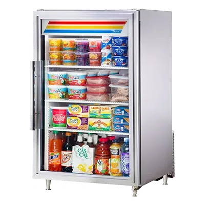 Discover kitchen perfection with the True Manufacturing GDM-07-S-HC~TSL01 Refrigerator Merchandiser. This countertop unit is a must-have for any commercial restaurant. With its sleek stainless steel exterior and white aluminum interior with a stainless steel floor, this refrigerator exudes both style and durability. The low-E thermal glass hinged door not only provides easy access to the contents but also helps to maintain the perfect temperature inside. The LED interior lighting illuminates the shelves, showcasing your products in the best possible light. The door sign decal allows you to customize the merchandiser with your own branding. With 3 shelves and a compact design, this refrigerator maximizes space efficiency. Made in the USA and ENERGY STAR certified, this True Manufacturing Refrigerator Merchandiser is not only reliable but also energy-efficient. Upgrade your restaurant's refrigeration system with this top-of-the-line unit.
