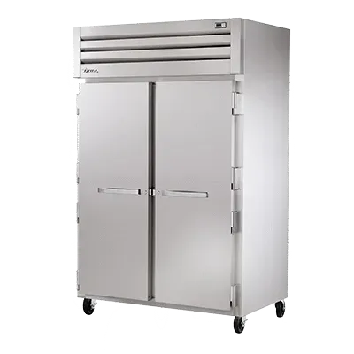Empower your kitchen staff with the True Manufacturing STR2R-2S-HC Refrigerator, Reach-In. This top-of-the-line refrigerator is designed to meet the demanding needs of a commercial restaurant. With its two-section design and stainless steel doors equipped with locks and cam-lift hinges, you can ensure the safety and security of your ingredients. The digital temperature control allows for precise temperature management, ensuring that your perishable items stay fresh for longer. The LED interior lights provide excellent visibility, making it easy for your staff to locate items quickly. Made in the USA, this refrigerator is built to last with its durable stainless steel front, sides, and interior. The 5" castors make it easy to move and clean around the unit. Additionally, the use of R290 Hydrocarbon refrigerant makes it an environmentally friendly choice. Trust True Manufacturing to deliver a reliable and efficient refrigeration solution for your commercial kitchen.