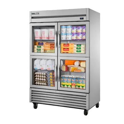 Introducing the True Manufacturing T-49G-4-HC~FGD01 Refrigerator, Reach-In - the perfect addition to drive restaurant profitability. This two-section reach-in refrigerator is designed to meet the demands of a busy commercial kitchen. With its framed glass half doors, you can easily see and access your ingredients without compromising on energy efficiency. The six adjustable PVC-coated wire shelves provide ample storage space for all your perishable items. The LED interior lighting illuminates the clear coated aluminum interior, making it easy to locate items even in low-light conditions. Made in the USA, this refrigerator features a stainless steel front and aluminum sides for durability and easy cleaning. Equipped with 4" castors, it can be effortlessly moved for cleaning or rearranging. With its ENERGY STAR certification and use of R290 Hydrocarbon refrigerant, this True Manufacturing refrigerator not only saves energy but also reduces environmental impact. Upgrade your restaurant's refrigeration system with the T-49G-4-HC~FGD01 and experience enhanced efficiency and profitability.