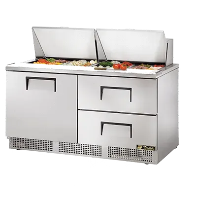 Unleash culinary creativity with the True Manufacturing TFP-64-24M-D-2 Refrigerated Counter, Mega Top Sandwich / Salad Unit. This two-section, self-contained unit is designed to meet the demands of a busy commercial restaurant kitchen. With its stainless steel front, top, and sides, as well as an aluminum back, this unit is built to withstand the rigors of a professional kitchen. The unit features a stainless steel insulated cover and an 8-inch thick cutting board, providing ample space for food preparation. Inside, you'll find an aluminum interior with a stainless steel floor, along with two adjustable shelves and two drawers. The rear-mounted refrigeration system ensures consistent cooling, while the 2-1/2-inch castors make it easy to move the unit around. With its versatility and durability, the True Manufacturing TFP-64-24M-D-2 is the perfect addition to any commercial restaurant looking to elevate their sandwich and salad offerings.