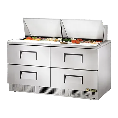 Kitchen innovation at its best, the True Manufacturing TFP-64-24M-D-4 Refrigerated Counter is a must-have for any commercial restaurant. This two-section, self-contained sandwich/salad unit is designed to meet the demands of a busy kitchen. With its (24) 1/6 size (4"D) poly pans, you can easily store and organize your ingredients. The stainless steel insulated cover ensures optimal temperature control, while the 8"D x 1/2" thick cutting board provides a convenient workspace. The four drawers can accommodate (2) 12" x 20" x 6"D pans each (pans not included), allowing for easy access to your prepped items. Made in the USA, this unit features a durable stainless steel front, top, and sides, as well as an aluminum back for long-lasting performance. The aluminum interior with a stainless steel floor is easy to clean, and the rear-mounted refrigeration system ensures efficient cooling. With its 2-1/2" castors, this unit is easy to move around your kitchen. Trust True Manufacturing for quality and reliability in your restaurant kitchen.