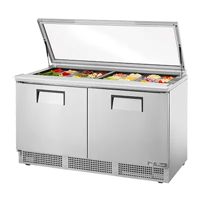 Kitchen innovation at its best, the True Manufacturing TFP-64-24M-FGLID Refrigerated Counter is a must-have for any commercial restaurant. This two-section, self-contained sandwich/salad unit is designed to meet the demands of a busy kitchen. With its heavy-duty flat glass lid and 24 poly pans, you can easily store and display a variety of fresh ingredients. The 8-inch thick cutting board provides ample space for food preparation, while the stainless steel front, top, and sides ensure durability and easy cleaning. The aluminum interior with a stainless steel floor is built to withstand heavy use, and the rear-mounted refrigeration system ensures consistent cooling. With four shelves and 2.5-inch castors, this unit offers convenient storage and mobility. Made in the USA and UL EPH Classified, the True Manufacturing TFP-64-24M-FGLID is a reliable and efficient addition to any commercial kitchen.