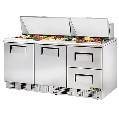 Cook with precision using the True Manufacturing TFP-72-30M-D-2 Refrigerated Counter, Mega Top Sandwich / Salad Unit. This three-section, self-contained unit is designed to meet the demands of a busy commercial restaurant. With its spacious interior, it can accommodate up to 30 1/6 size poly pans, allowing you to store a variety of ingredients for sandwiches and salads. The stainless steel insulated cover ensures that your ingredients stay fresh and at the perfect temperature. The unit also features a convenient 8-inch thick cutting board, providing a dedicated space for food preparation. The stainless steel construction of the front, top, and sides, along with the aluminum back, ensures durability and easy cleaning. The two doors and two drawers provide easy access to your ingredients, and the adjustable wire shelves allow for flexible storage options. With its rear-mounted refrigeration and 1/3 HP compressor, this unit delivers efficient cooling while minimizing noise. Trust True Manufacturing for a reliable and efficient refrigerated counter that will enhance your restaurant's food preparation process.