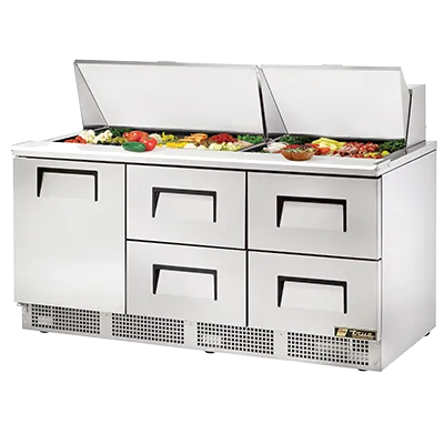 Enhance your commercial kitchen with the True Manufacturing TFP-72-30M-D-4 Refrigerated Counter, Mega Top Sandwich / Salad Unit. This three-section, self-contained unit is designed to meet the demands of a busy restaurant kitchen. It comes with (30) 1/6 size (4"D) poly pans, allowing you to store a variety of ingredients for sandwiches and salads. The stainless steel insulated cover keeps your ingredients fresh and ready to use. The unit also features an 8"D x 1/2" thick cutting board, providing a convenient workspace for food preparation. With its stainless steel front, top, and sides, as well as an aluminum back, this unit is built to withstand the rigors of a commercial kitchen. The (1) door and (4) drawers offer ample storage space, accommodating various pan sizes. The aluminum interior with a stainless steel floor ensures durability and easy cleaning. The rear-mounted refrigeration system keeps your ingredients at the perfect temperature. With its 2-1/2" castors, this unit is easy to move and clean around. Trust True Manufacturing, a reputable brand known for its quality and reliability. Invest in the TFP-72-30M-D-4 Refrigerated Counter, Mega Top Sandwich / Salad Unit to streamline your kitchen operations and deliver fresh, delicious sandwiches and salads to your customers.