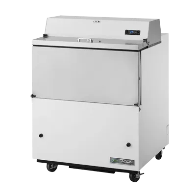 Elevate your cuisine with the True Manufacturing TMC-34-HC Milk Cooler / Station. This mobile milk cooler is designed to meet the needs of commercial restaurants, ensuring that your dairy products are stored at the perfect temperature. With its forced-air cooling system, this cooler maintains a temperature range of 33 - 38F, keeping your milk and other dairy products fresh and ready for use. The stainless steel door with a drop front and hold-open flip-up lids provides easy access to the contents, while the lock ensures the security of your inventory. The white vinyl exterior and aluminum interior with a stainless steel floor not only make this cooler durable but also easy to clean. The TMC-34-HC comes with two heavy-duty floor racks, allowing you to store and organize up to eight crates of milk. The digital thermometer lets you monitor the temperature at a glance, ensuring that your dairy products are always stored at the optimal conditions. With its R290 Hydrocarbon refrigerant, this milk cooler is environmentally friendly and energy-efficient. The 4" castors make it easy to move the cooler around your kitchen as needed. Made in the USA, this True Manufacturing milk cooler is cULus and UL EPH Classified, guaranteeing its quality and safety. Elevate your restaurant's dairy storage with the True Manufacturing TMC-34-HC Milk Cooler / Station.