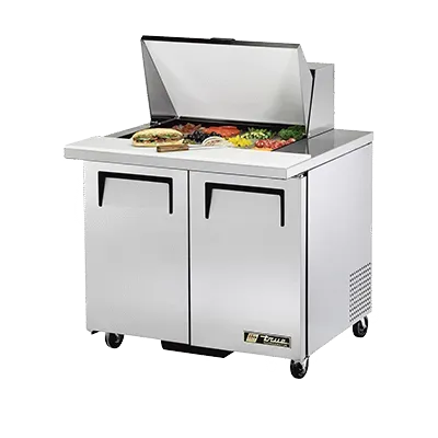 Master the art of flavor with the True Manufacturing TSSU-36-12M-B-HC Refrigerated Counter, Mega Top Sandwich/Salad Unit. This top-of-the-line unit is designed to meet the demands of a busy commercial restaurant, ensuring that your ingredients stay fresh and ready for use. With its mega top design, this unit can accommodate up to 12 1/6 size poly pans, allowing you to store a variety of toppings, dressings, and condiments. The stainless steel insulated cover keeps everything at the perfect temperature, while the 8-7/8" cutting board provides a convenient workspace for assembling sandwiches and salads. The stainless steel construction of the top, front, and sides, along with the aluminum back, ensures durability and easy cleaning. The unit also features two full doors and four shelves for additional storage. With its efficient refrigeration system and hydrocarbon refrigerant, this unit is not only energy-efficient but also environmentally friendly. Trust True Manufacturing to deliver a reliable and high-quality refrigerated counter that will enhance your restaurant's efficiency and productivity.