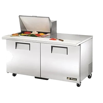 Invest in superior quality with the True Manufacturing TSSU-60-12M-B-HC Refrigerated Counter, Mega Top Sandwich / Salad Unit. This top-of-the-line unit is designed to meet the demanding needs of commercial restaurants. With its stainless steel insulated cover and 8-7/8"D cutting board, it provides a hygienic and convenient workspace for preparing sandwiches and salads. The unit features (12) 1/6 size (4"D) poly pans, allowing for efficient organization and easy access to ingredients. The stainless steel top, front, and sides, along with the aluminum back, ensure durability and longevity. The aluminum interior with a stainless steel floor is easy to clean and maintain. Equipped with (2) full doors and (4) shelves, this unit offers ample storage space for your ingredients and supplies. The 5" castors make it easy to move the unit around the kitchen. With its energy-efficient design and R290 Hydrocarbon refrigerant, this unit not only saves on energy costs but also helps reduce environmental impact. Invest in the True Manufacturing TSSU-60-12M-B-HC and elevate your restaurant's efficiency and productivity.