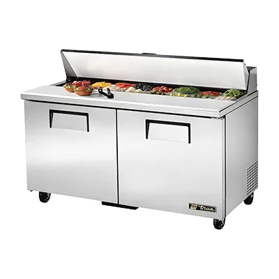 Cook with precision using the True Manufacturing TSSU-60-16-HC Refrigerated Counter, Sandwich / Salad Unit. This top-of-the-line unit is designed to meet the demanding needs of commercial restaurants. With its stainless steel insulated cover and aluminum interior with a stainless steel floor, this unit ensures optimal temperature control and durability. The unit features (16) 1/6 size poly pans, perfect for storing and organizing your sandwich and salad ingredients. The 11-3/4" cutting board provides ample space for food preparation, while the (2) full doors and (4) adjustable PVC wire shelves offer easy access and customizable storage options. Equipped with 5" castors, this unit is easy to move and clean. The TSSU-60-16-HC runs on R290 Hydrocarbon refrigerant and has a 1/3 HP compressor, ensuring energy efficiency and reliability. Made in the USA, this True Manufacturing unit is cULus and UL EPH Classified, guaranteeing its quality and safety. Upgrade your restaurant's kitchen with the TSSU-60-16-HC Refrigerated Counter, Sandwich / Salad Unit and experience the difference in performance and convenience.