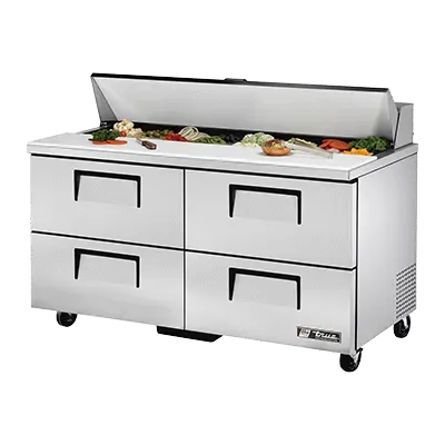 Elevate your dining experience with the True Manufacturing TSSU-60-16D-4-HC Refrigerated Counter, Sandwich / Salad Unit. This top-of-the-line unit is designed to meet the demands of a busy commercial restaurant. With its stainless steel top, front, and sides, as well as an aluminum back, this unit is not only durable but also easy to clean. The unit features (16) 1/6 size poly pans with a 4-inch depth, perfect for storing and organizing your sandwich and salad ingredients. The stainless steel insulated cover ensures that your ingredients stay fresh and at the right temperature. The unit also comes with (4) drawers that can accommodate a 6-inch deep pan (not included). With its 11-3/4-inch cutting board and 5-inch castors, this unit provides convenience and mobility. Made in the USA and certified by cULus and UL EPH Classified, you can trust the quality and reliability of True Manufacturing. Upgrade your restaurant's food preparation area with this exceptional refrigerated counter.