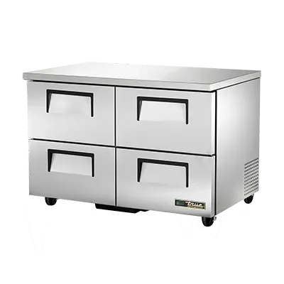 Unleash your inner chef with the True Manufacturing TUC-48D-4-HC Refrigerator. This undercounter reach-in refrigerator is a must-have for any commercial restaurant. With its stainless steel top and sides, it not only looks sleek and professional but is also durable and easy to clean. The four drawers provide ample storage space and can accommodate a 12" x 18" x 6" food pan, allowing you to keep your ingredients organized and easily accessible. The aluminum interior with a stainless steel floor ensures optimal temperature retention, while the R290 Hydrocarbon refrigerant and 1/5 HP compressor provide efficient cooling. With 5" castors, this refrigerator is easy to move and clean around. Made in the USA and certified by cULus, UL EPH Classified, and CE, you can trust in the quality and reliability of this True Manufacturing refrigerator. Upgrade your kitchen with the TUC-48D-4-HC and experience the convenience and efficiency it brings to your culinary endeavors.