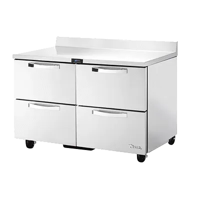 Unleash culinary creativity with the True Manufacturing TWT-48D-4-HC~SPEC3 Refrigerated Counter. This work top refrigerator is a must-have for any commercial restaurant. With its SPEC Package 3, it offers a 16-gauge stainless steel top with a rear splash, as well as stainless steel front, sides, and back for durability and easy cleaning. The stainless steel interior and four drawers provide ample storage space for food items, accommodating a 12" x 18" x 6" food storage box in each drawer. The electronic temperature control with a digital display ensures precise temperature management, while the 5" castors allow for easy mobility. Made in the USA, this refrigerator is not only reliable but also environmentally friendly, thanks to its use of R290 Hydrocarbon refrigerant. Upgrade your kitchen with the True Manufacturing TWT-48D-4-HC~SPEC3 Refrigerated Counter and experience the convenience and efficiency it brings to your culinary endeavors.