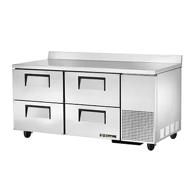 Elevate your culinary experience with the True Manufacturing TWT-67D-4-HC Refrigerated Counter. This two-section work top refrigerator is designed to meet the demands of a busy commercial restaurant. With its stainless steel top and rear splash, it not only provides a durable and easy-to-clean surface but also adds a touch of elegance to your kitchen. The four drawers of this unit can accommodate two 12" x 20" x 8" pans each, allowing for efficient organization and easy access to ingredients. The aluminum interior with a stainless steel floor ensures optimal temperature retention, while the side mount front breather and R290 Hydrocarbon refrigerant contribute to energy efficiency. Made in the USA, this True Manufacturing Refrigerated Counter is cULus and UL EPH Classified, guaranteeing its quality and safety. Upgrade your kitchen with this reliable and versatile work top refrigerator.