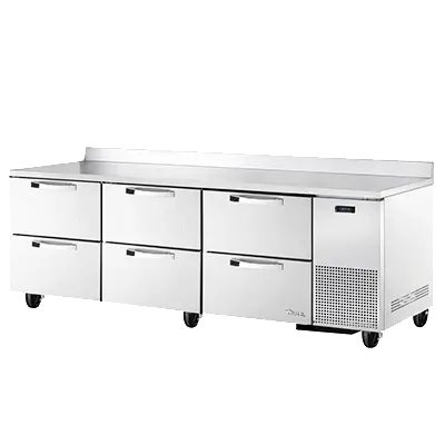 Boost your restaurant's performance with the True Manufacturing TWT-93D-6-HC~SPEC3 Refrigerated Counter Work Top. This three-section work top refrigerator is part of the SPEC SERIES, designed to meet the demanding needs of commercial kitchens. It features a 16-gauge stainless steel top with a rear splash, ensuring durability and easy cleaning. The stainless steel front, sides, and back further enhance its longevity and professional appearance. With six drawers, each accommodating two 12" x 20" x 8" pans (not included), you'll have ample storage space for your ingredients. The electronic temperature control with a digital display allows for precise temperature management, ensuring your perishable items stay fresh. The 5" castors make it easy to move the refrigerator for cleaning or rearranging your kitchen layout. Made in the USA, this True Manufacturing work top refrigerator is UL EPH Classified and uses R290 Hydrocarbon refrigerant, making it an energy-efficient and environmentally friendly choice. Upgrade your kitchen with this reliable and efficient refrigerated counter work top.