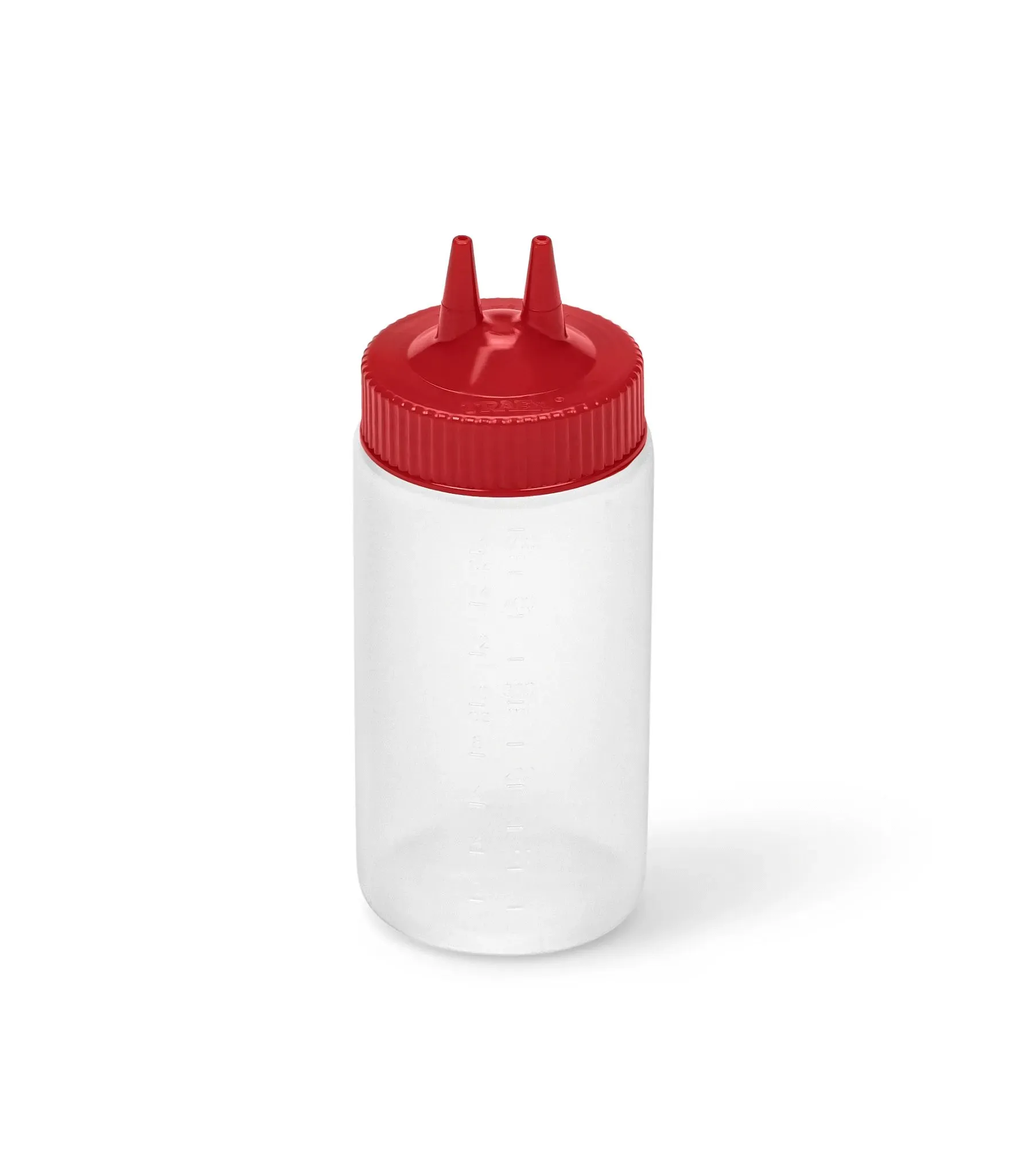Provide easy access to popular condiments with the Traex Color-Mate Twin Tip wide-mouth squeeze dispenser by Vollrath. With this dispenser, you'll be able to provide easy, mess-free service, every time! The durable yet flexible polyethylene construction is easy to squeeze for fast service, and the clear bottle offers excellent visibility, allowing you and your guests to identify the contents at a glance. Meanwhile, the red top fits perfectly into your color-coded system. The Twin Tip design saves time in high-volume areas and allows you to quickly dispense condiments on larger food items like salads, sandwiches, and more. Cut the tips to dispense more viscous sauces, or leave as is for thinner liquids. Thanks to the clearly embossed capacity graduations, it's easy to monitor and control portions. The wide mouth ensures easy refilling, and both the bottle and the top are dishwasher safe, for fast, convenient cleaning.