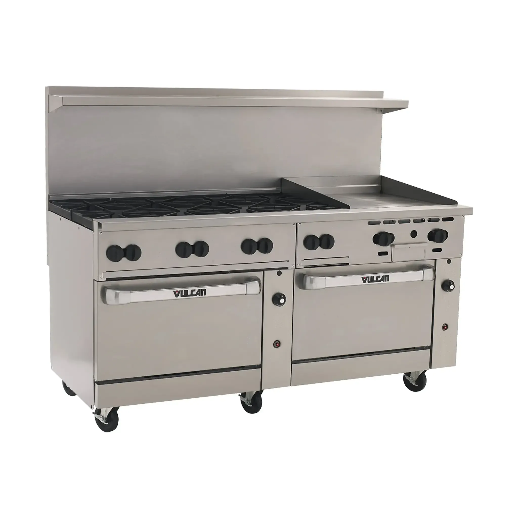 Discover kitchen perfection with the Vulcan, 72SC-8B24GT, Range, 72" Restaurant, Gas. This Endurance Restaurant Range is designed to meet the demands of a busy commercial kitchen. With eight 30,000 BTU burners and lift-off burner heads, you have the power and flexibility to cook multiple dishes simultaneously. The 24" x 3/4" thick griddle with thermostatic controls allows for precise temperature control and even heat distribution. The 4" wide front grease trough ensures easy cleanup and maintenance. This range also features a standard oven on the left and a convection oven on the right, providing versatility for baking and roasting. The stainless steel construction of the front, sides, backriser, and high shelf ensures durability and easy cleaning. With a fully MIG welded frame and 6" adjustable legs, this range is built to withstand the rigors of a commercial kitchen. With a powerful 350,000 BTU output and certifications from CSA Flame, CSA Star, and NSF, the Vulcan, 72SC-8B24GT, Range, 72" Restaurant, Gas is the perfect addition to any commercial restaurant.