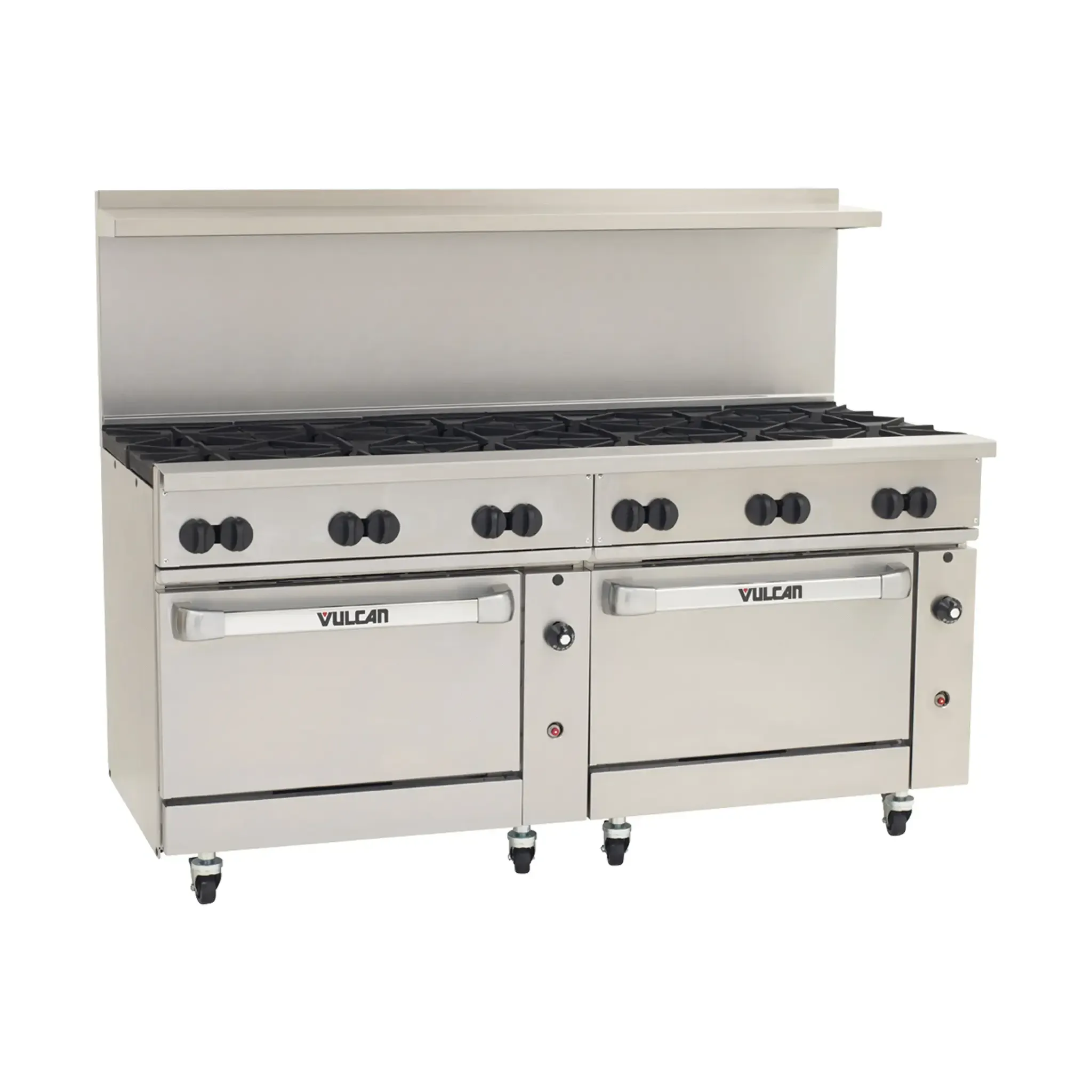 Boost your restaurant's performance with the Vulcan 72SS-12B Range. This gas restaurant range is designed to meet the demands of a busy commercial kitchen. With 12 powerful 30,000 BTU burners, each equipped with lift-off burner heads, you can easily cook multiple dishes simultaneously. The two standard oven bases provide ample space for baking and roasting, allowing you to expand your menu options. The stainless steel construction of the front, sides, backriser, and high shelf ensures durability and easy cleaning, while the fully MIG welded frame adds stability and strength. The 6" adjustable legs allow for easy leveling on any surface. With a total BTU of 430,000, this range delivers exceptional cooking performance. CSA and NSF certified, you can trust the quality and safety of this Vulcan range. Upgrade your kitchen with the Vulcan 72SS-12B Range and experience enhanced efficiency and productivity.
