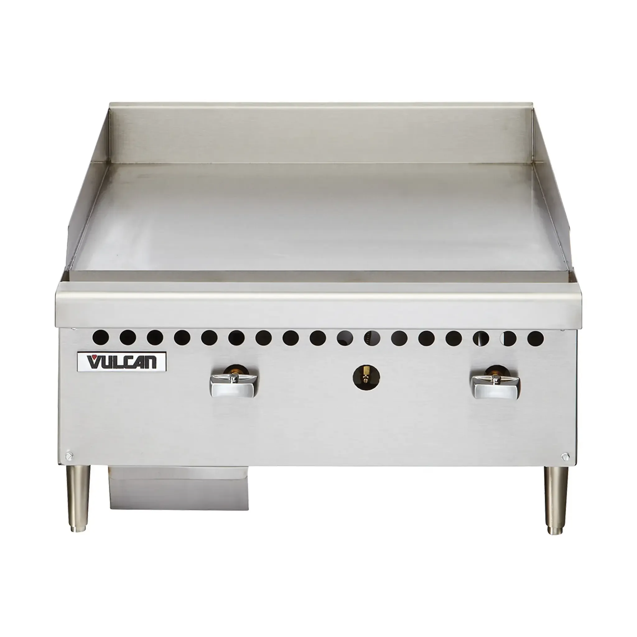 Elevate your culinary experience with the Vulcan VCRG48-M Gas Countertop Griddle. This high-quality griddle is designed to meet the demands of a busy commercial restaurant kitchen. With a spacious 48" wide by 20-1/2" deep cooking surface, you'll have plenty of room to cook multiple dishes at once. The 1" thick polished steel griddle plate ensures even heat distribution and excellent heat retention, while the four burners provide precise temperature control. The fully welded construction and stainless steel front, sides, and front top ledge make this griddle durable and easy to clean. The low profile design and adjustable legs allow for easy installation and customization to fit your kitchen setup. With a powerful 100,000 BTU output, this griddle is capable of handling any cooking task. Trust Vulcan, a leading name in commercial kitchen equipment, to deliver exceptional performance and reliability.
