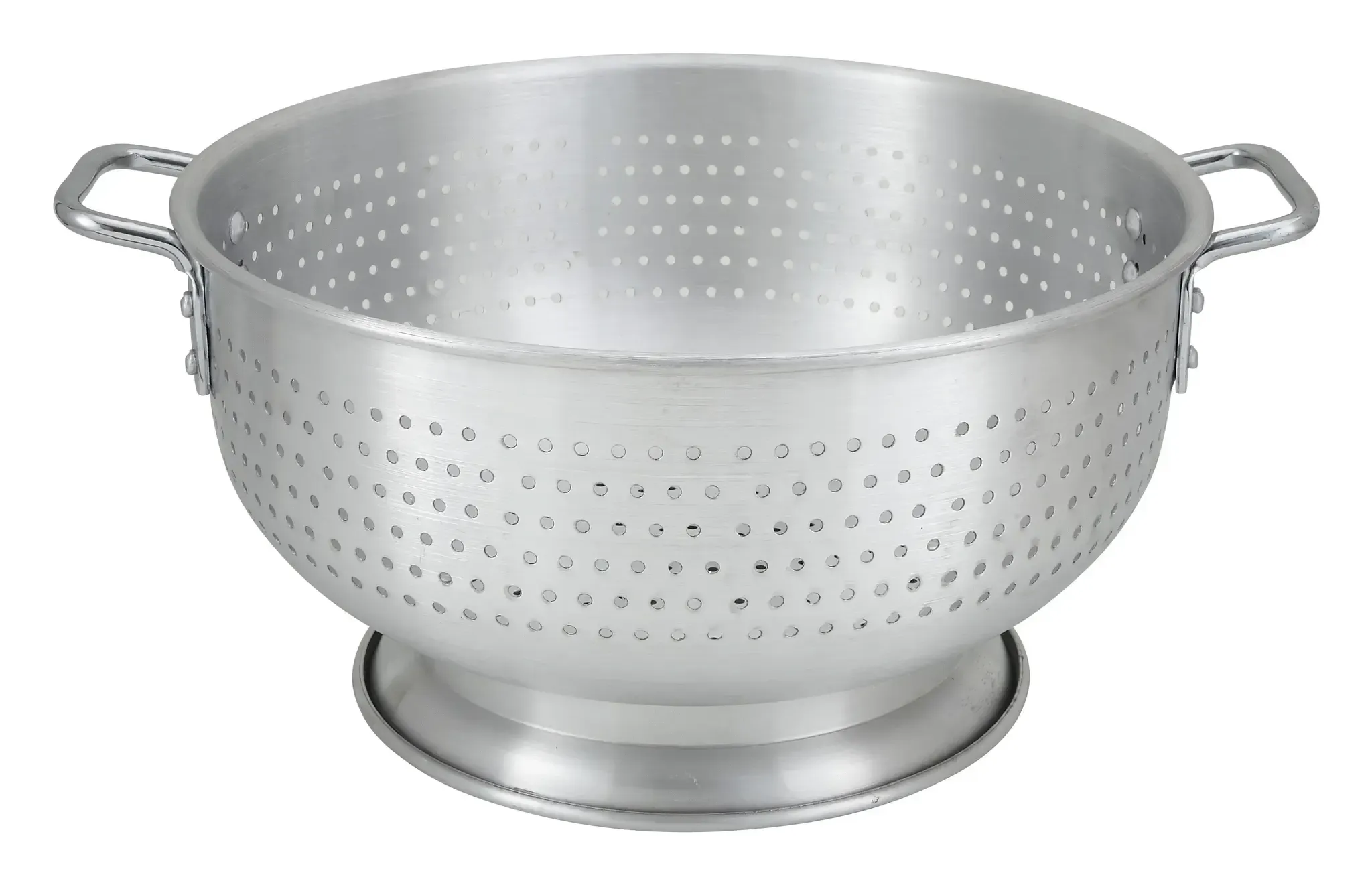 Crafted from durable aluminum, the Winco Colander ensures longevity and reliability, even with frequent use. Its dimensions, 16-1/2 inches in diameter and 7-1/8 inches in height, provide ample space for efficient draining while maintaining a manageable size for easy handling and storage. The integrated base and sturdy handles enhance stability and convenience, allowing for safe and effortless transportation of contents.